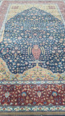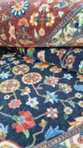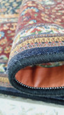 قدمهات روی قالیچهای میافته که زمینه سرمهای عمیق و حاشیه قرمز گرمش، حالوهوای خونه رو تغییر میده.