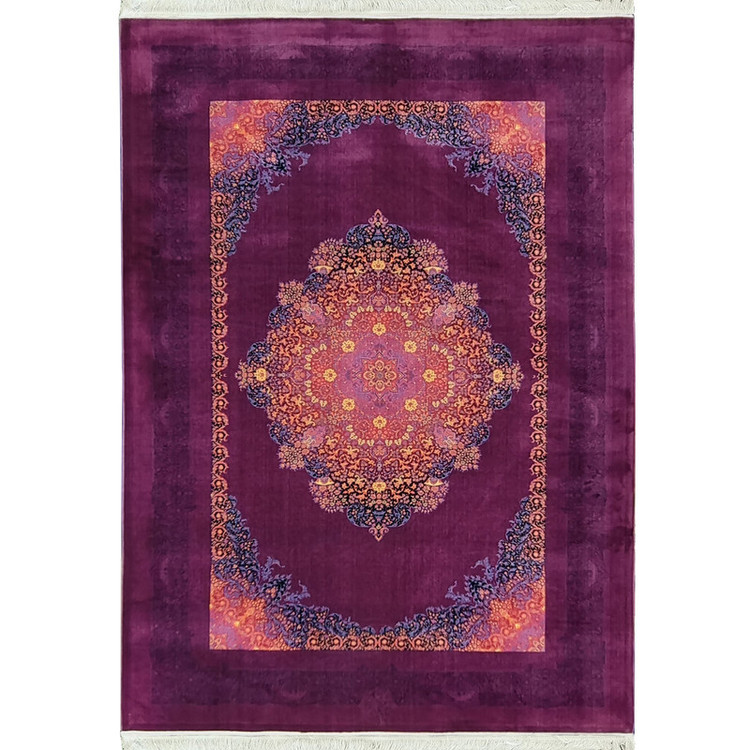 فرش ماشینی با زمینه بنفش و ترنج مرکزی در طیفهای نارنجی، صورتی و آبی، انتخابی جسورانه و هنری برای فضاهای خاص است. طراحی متقارن، نقشهای گلدار و هندسی، و رنگهای گرم، این فرش را به نقطهی تمرکز دکوراسیون شما تبدیل میکند.