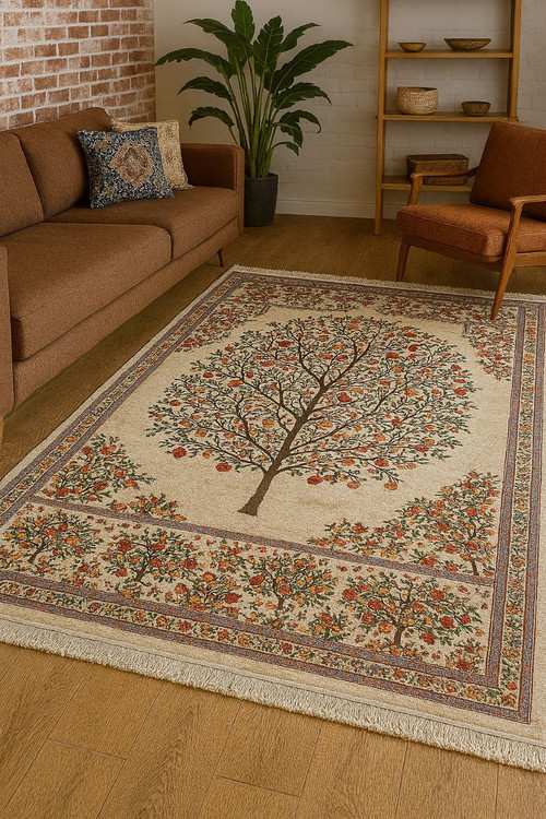فرش پیشرو با طرحی الهامگرفته از درخت زندگی، نهتنها یک کفپوش زیباست، بلکه روایتگر پیوندی عمیق میان طبیعت، فرهنگ و هنر ایرانی است. زمینهی کرمرنگ فرش، بستری آرام برای شاخههای پرپیچوخم درختی فراهم کرده که با انار، پرتقال و گلهای سرخ تزئین شدهاند—نمادهایی از برکت، عشق و زندگی.