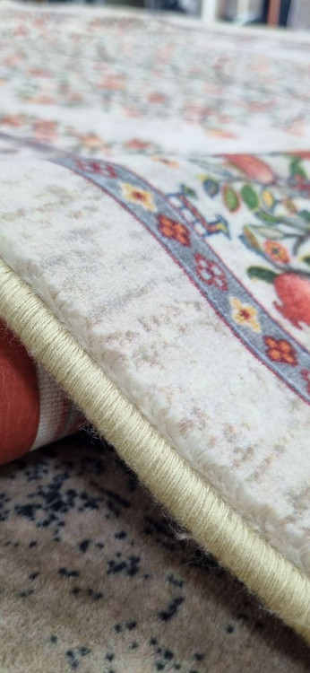 🧼 رنگ روشن زمینه نیازمند مراقبت بیشتر برای جلوگیری از لک شدن و تغییر رنگ در طول زمان است ولی به راحتی میتوانید این فرش رو در منزل با آب و مایع ظرفشویی بشورید.