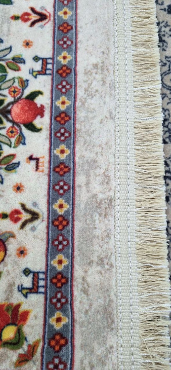 🧵 جزئیات دقیق در بافت: حاشیههای چندلایه با نقشهای گلدار و میوهای، نشاندهندهی دقت بالا در طراحی و اجرای فرش هستند.