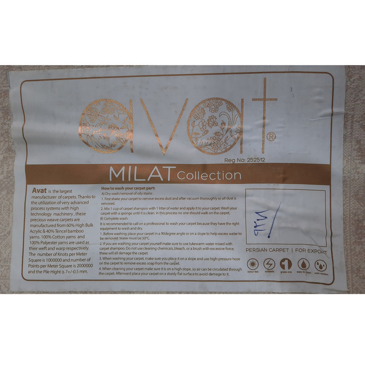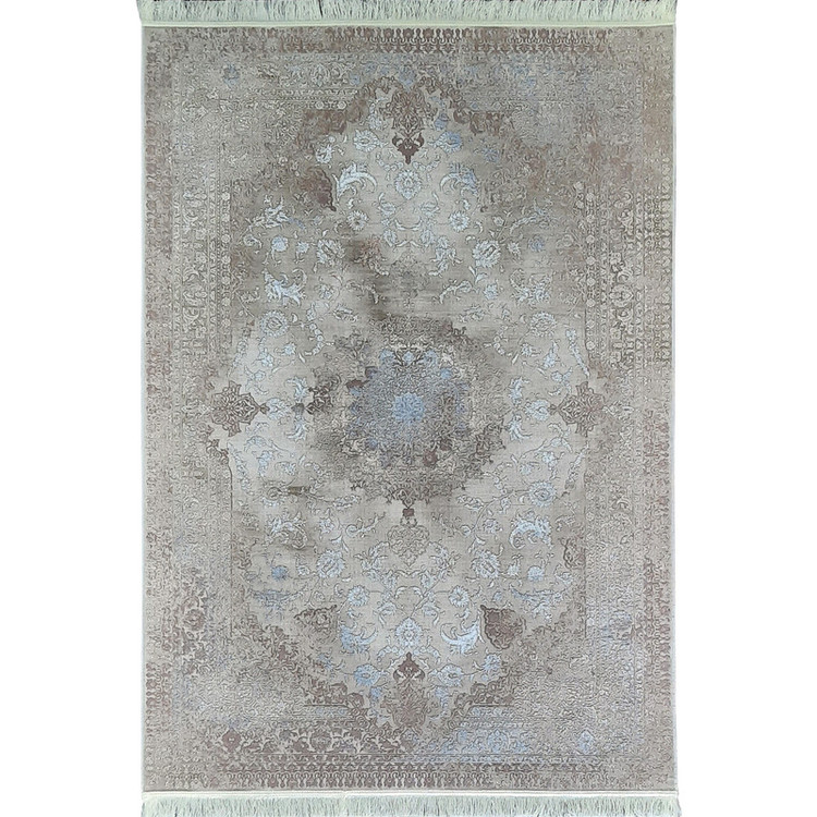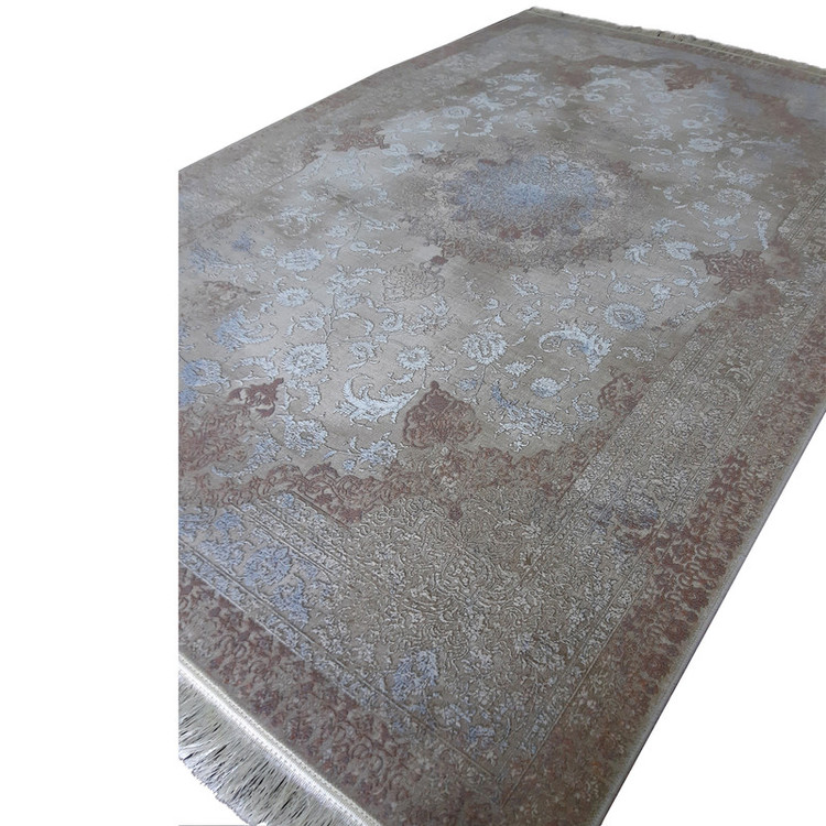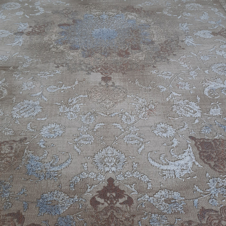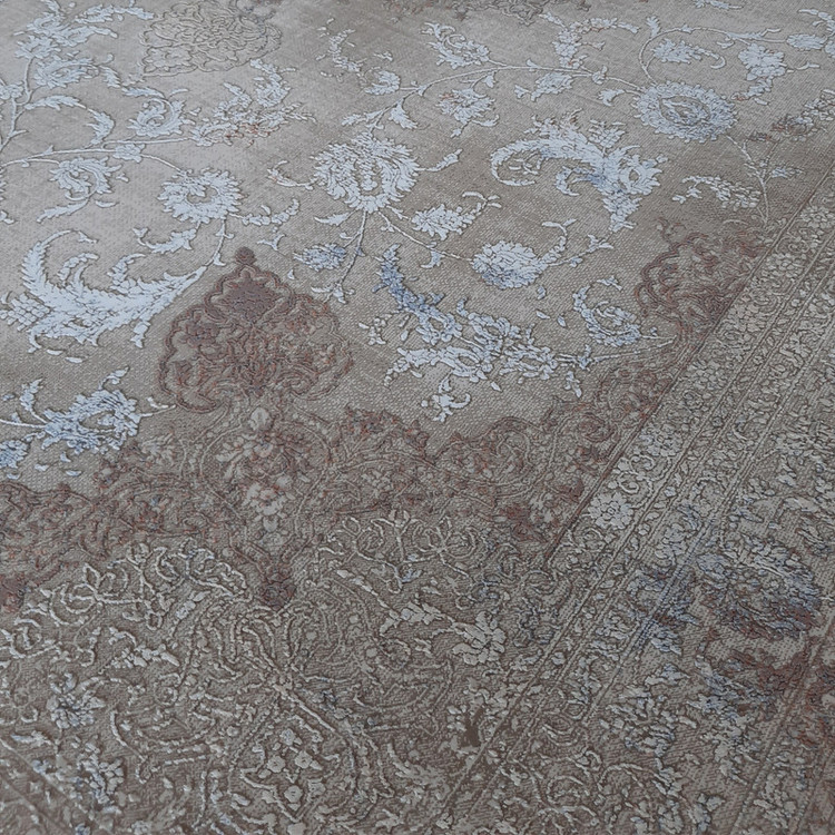 فرش ماشینی ۱×۱.۵ متری آوات | نقش برجسته وینتیج | زمینه نسکافه‌ای با نقوش قهوه‌ای و آبی